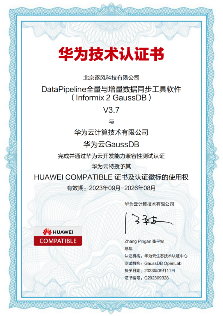 我们很高兴地宣布与华为云GaussDB的产品兼容性互认证成功完成。经过深入的联合测试,结果证实了DataPipeline的全量与增量数据同步工具软件能够实现Informix数据向GaussDB的全量与增量实时同步。此项能力不仅满足了用户间异构数据库实时同步的需求,也为企业的国产化和数字化转型提供了有力支持。