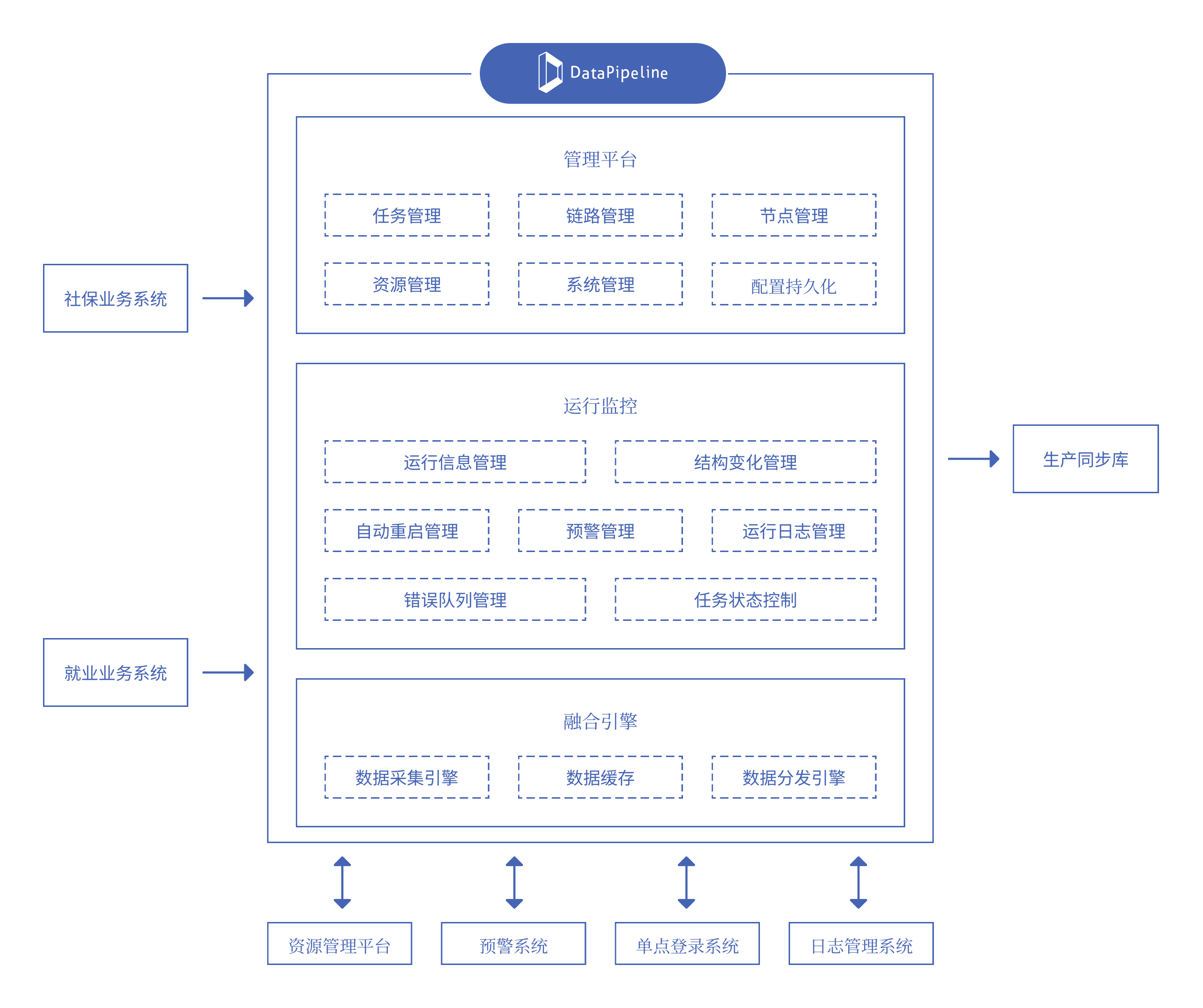 在项目建设中,DataPipeline企业级实时数据融合平台承担了核心的数据汇聚与分发工作。平台实现了对上游社保业务库与就业业务库等多源系统的高效适配,能够在异构数据库环境下稳定采集和同步关键业务数据。同时,平台为下游生产同步库提供统一、实时、可靠的数据服务,确保各级部门能够在统一的数据底座上实现信息共享与业务协同。