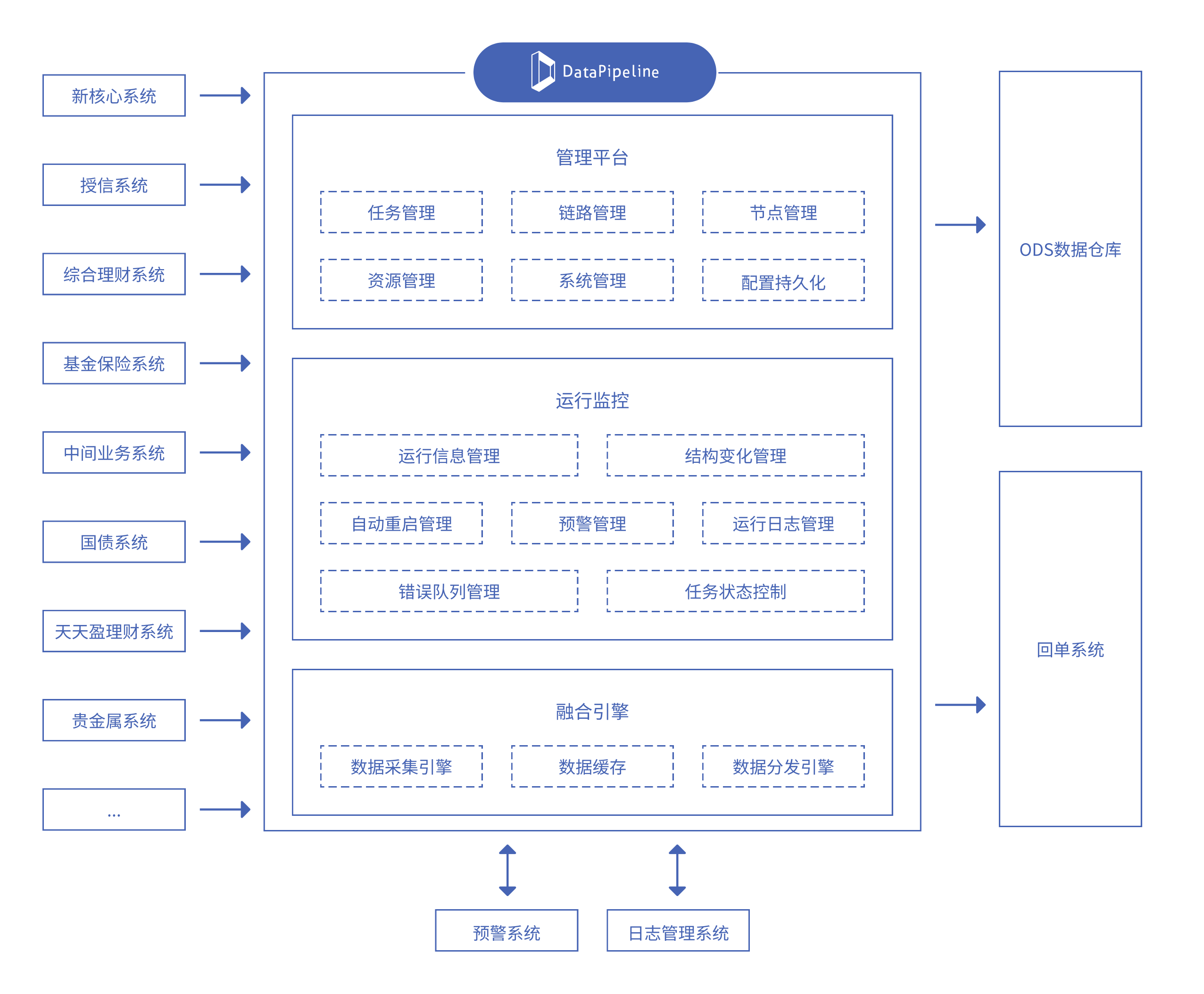 DataPipeline企业级实时数据融合平台适配了其包括OceanBase、GBASE南大通用、Kafka等多种数据库管理技术,确保不同技术之间的无缝连接。平台支持从新核心系统、授信系统、综合理财系统、基金保险系统、中间业务系统、国债系统、天天盈理财系统、贵金属系统等上游采集数据,实时同步到下游如ODS数据仓库和回单系统。