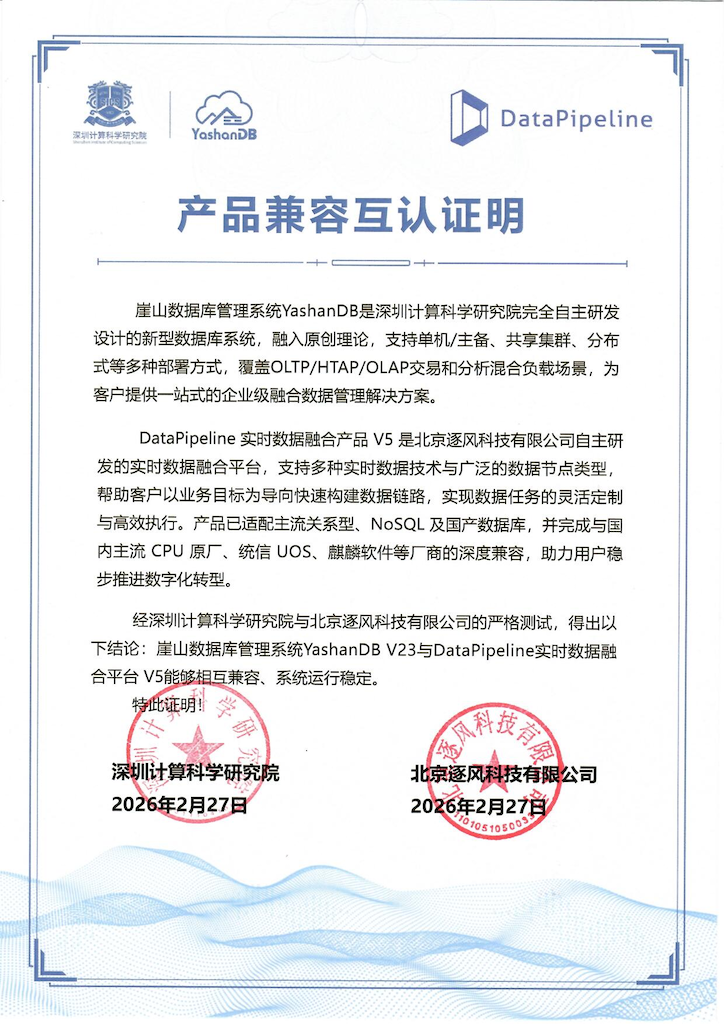 在此背景下,近日,DataPipeline实时数据融合平台与崖山数据库管理系统YashanDB 完成生态适配与兼容性验证,为国产数据基础设施的协同应用提供了可靠参考。
