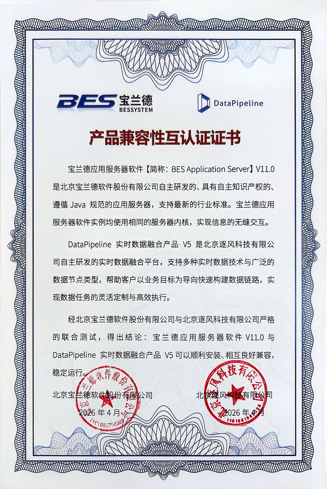 在本次兼容性测试中,双方围绕产品安装部署、协同运行、功能兼容性及运行稳定性等方面进行了联合验证。测试结果表明,宝兰德应用服务器软件V11与 DataPipeline实时数据融合产品V5能够实现良好兼容并稳定运行,满足联合使用需求。